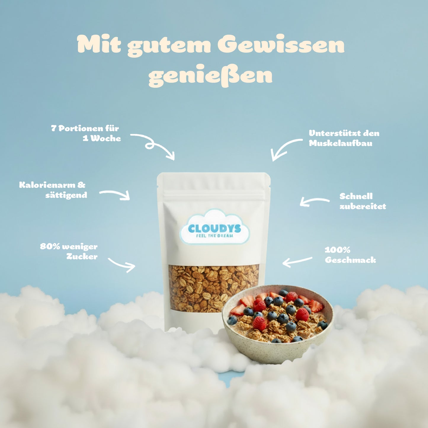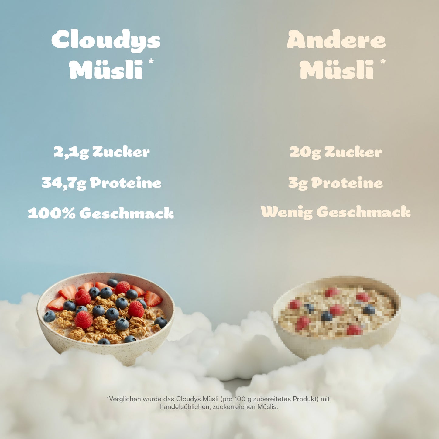 Sich was gönnen ohne schlechtes Gewissen ? Jetzt mit CLOUDYS Protein Müsli. Über 30g PROTEIN, lower calories, aber natürlich mit dem klassischen CLOUDYS Geschmack! Glaub mir du schmeckst keinen Unterschied!
