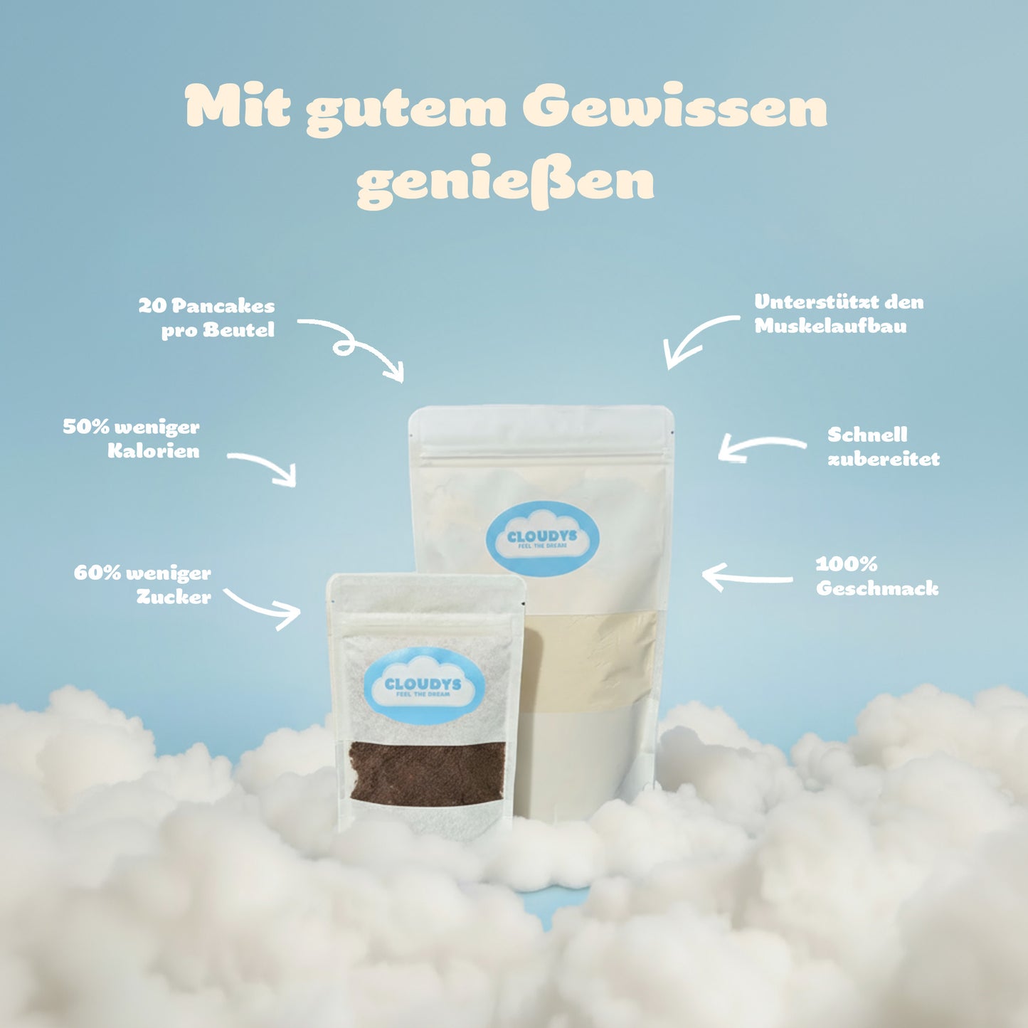 Sich was gönnen ohne schlechtes Gewissen ? Jetzt mit CLOUDYS Protein Bundle. Über 100g PROTEIN, lower calories, aber natürlcih mit dem klassischen CLOUDYS Geschmack! Glaub mir du schmeckst keinen Unterschied!